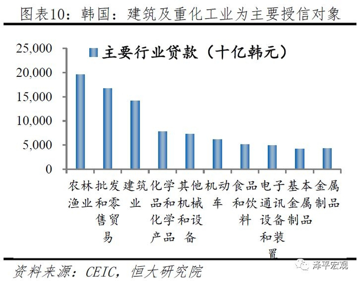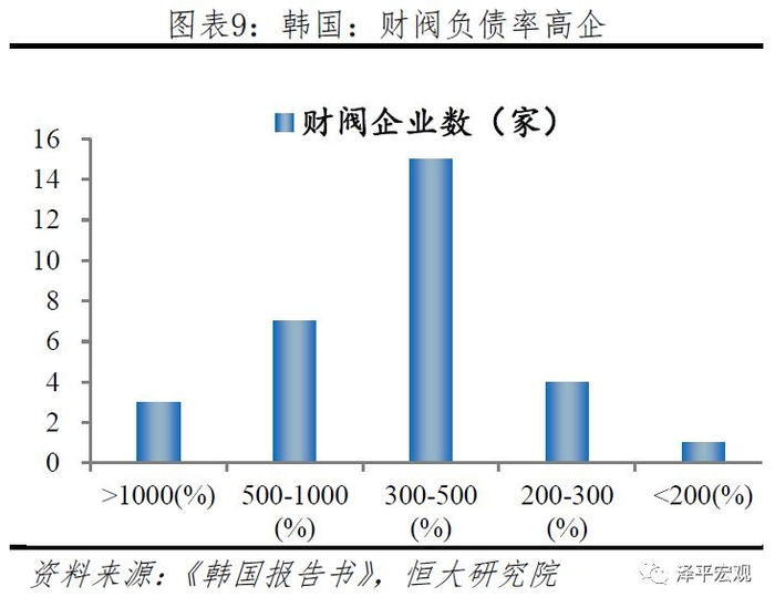 韩国在60-80年代的高速追赶期,同样存在着经济结构性问题,大量政府隐性担保的存在导致企业盲目扩张,存在投资饥渴症,缺乏自律性,过度的政策保护和扶持导致了低效率和高负债,1998年末建筑及其他重化工业产品成为韩国商业银行授信占比靠前的行业。此外,由于企业做的越大越能得到政府各种支持,导致大企业与中小企业差距越拉越大,财阀资产负债率高企,大量财阀资产负债率位于300-500%区间(任泽平,2010)。