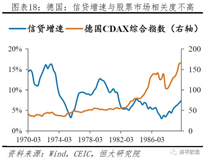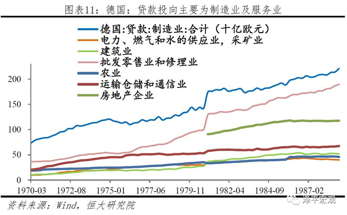 但信贷的结构性不必然带来经济结构的恶化。二战后到20世纪80年代,德国同样主要以信贷渠道作为主要传导渠道。但政府所重视的支柱产业是高附加值和技术密集型的汽车制造、航空航天、机械仪器和化工医药等产业,德国支柱性产业从90年代以前靠制造业,到90年代以后靠“现代服务业+制造业”。全能银行制度建立起银企之间更加全面的合作关系,减少信息不对称和道德风险,贷款对于相关产业的支持也成为成就“德国制造”的重要助推力。