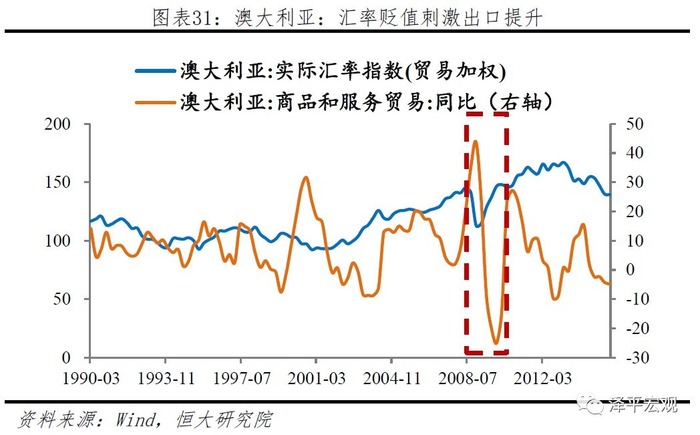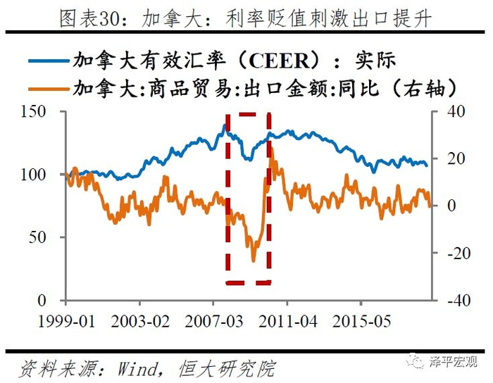 与信贷渠道传导相比,利率渠道对于汇率渠道的联动效应也较为明显。从美加澳三国情况来看,降低的利率带动本币贬值,从而刺激出口提升。然而汇率渠道的联动效应受多种因素影响,贸易争端、本国经济结构、出口占比等因素均会影响汇率渠道传导效果,此外以邻为壑的竞争性贬值虽短期可以刺激外需提升,但极易引发贸易保护主义,危害全球经济平衡,且难以解决自身经济内需不足等根本问题。