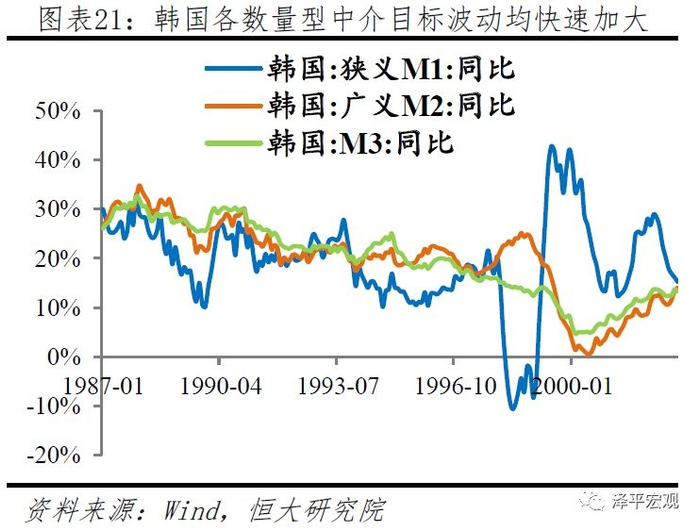 韩国在建国初期至20世纪90年代期间,由于数量型中介目标稳定性下降,不断扩大中介目标范围,从一开始的M1,逐步扩大至M2、MCT(包含M2、大额存单和货币市场基金)、以及M3。随着利率市场化不断推进,1997年韩国逐步取消所有存款利率管制,货币政策目标过渡至隔夜回购利率,1999年正式将货币政策调控框架由数量型转变为价格型。