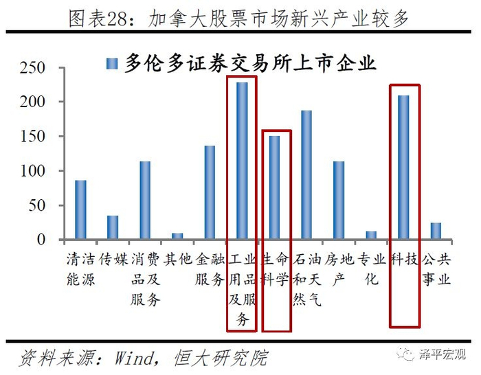 其次,资本市场的快速发展对于实体经济转型升级也能起到积极作用。纳斯达克上市企业中,除金融行业外,医疗、科技等领域上市企业显著高于其他行业,多伦多证券交易所上市企业中,除采矿业外,工业用品、科技、生命科学等领域上市公司也占据主导地位。股票市场较高的风险偏好为难以获得银行信贷、抵押品缺乏、甚至暂无盈利的新兴行业提供了有效的金融资源支持,有助于推动经济结构转型升级,形成新的增长引擎。