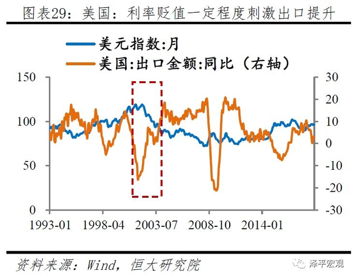 (3)对汇率渠道传导:短期的低利率带动本币贬值,从而刺激出口提升,提升经济恢复动力。