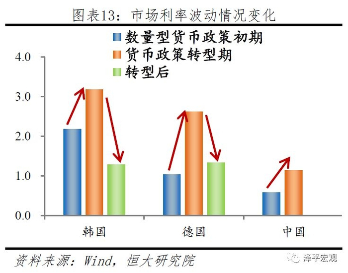 韩国及德国案例显示,在数量型货币政策使用初期,以标准差计算的市场利率波动均较为平稳,随着金融深化推进,货币需求稳定性降低,市场利率波动明显加大。而转型为价格型货币政策调控框架后,市场利率波动明显降低。