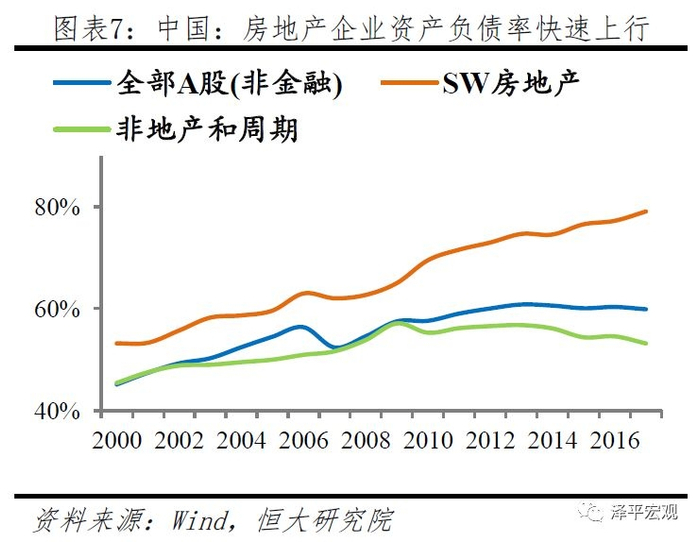 我国国企和地方政府融资平台具有预算软约束背书,即使借款主体陷入财务困境仍可获得外部资源救助,而房地产行业具有房价背书,“房价永远会涨”的信仰使得房地产企业具有持续的借贷意愿。以我国上市公司资产负债率为例,2000年以来,我国房地产企业资产负债率由53%上升至79%,过剩产能行业及国企集中的行业杠杆率平均上升20个百分点,金融资源大量积聚。