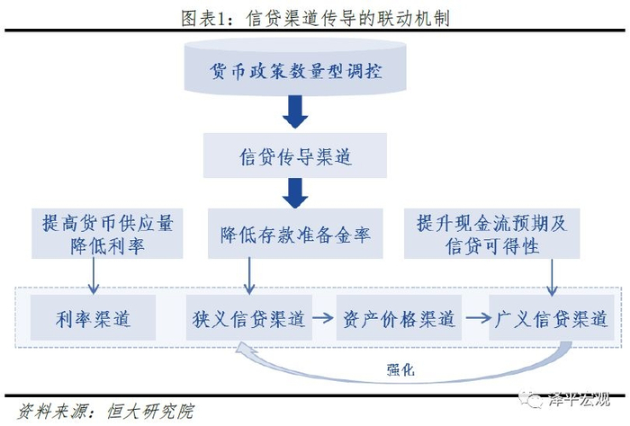 信贷渠道包含狭义信贷渠道以及广义信贷渠道,通常来看,货币政策数量型操作直接影响狭义信贷渠道,即央行通过调整货币政策工具,例如降低商业银行存款准备金,使得银行可用于放贷的资金增多,企业可以获得更多贷款用于经营和扩大投资,社会总产出随之增加。同时,数量型的货币政策部分也可通过广义信贷渠道产生影响,通过影响企业部门的现金流预期,以及居民部门的信贷可得性,修复企业和居民部门资产负债表,提升信贷需求。