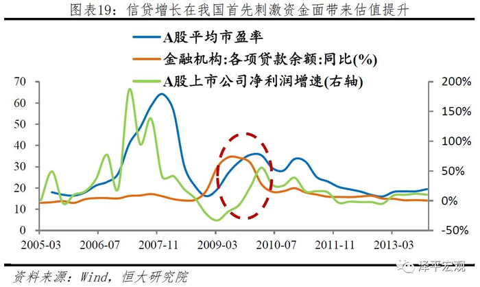 而在股价方面,信贷渠道对于股票市场价格的影响相对来说较弱,且在我国对资金面影响大于基本面。以韩国及德国为例,在货币政策操作框架由数量型转为价格型之前,资本市场整体表现较为平淡,信贷与股价走势相关度不高。王晓明(2010)曾对我国1998年1月-2009年6月区间数据进行分析发现,银行信贷对房地产价格影响更大,但是银行信贷与股票价格因果关系不显著。此外,信贷增长对于股票价格的影响,资金面先于基本面,以我国2009至2010年信贷高速增长期为例,信贷增长后首先刺激估值提升,时滞约为1个季度,其次才有效刺激上市企业净利润增速提升,时滞达3个季度,信贷传导渠道对于资金面的影响易造成高估值泡沫以及剧烈的资产价格波动。