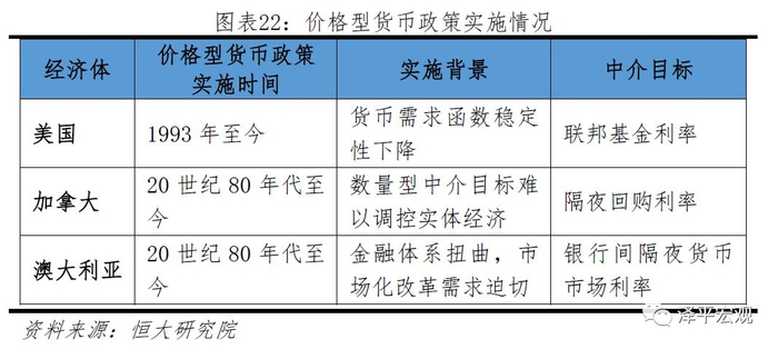 (3)20世纪80年代至金融危机前,由于金融市场的不断发展,金融创新及金融自由化影响,数量型中介目标无法有效掌控实体经济实际货币量水平,面临转型压力。同时新凯恩斯理论出现,吸收新古典主义思想,认为货币是内生的,短期非中性但长期是中性的,货币政策的主要功能应当是逆周期调节,通过控制短期利率,将总需求调整在潜在增长率附近,维持物价稳定。这一时期,主要国家货币政策中介目标再次转向价格型,并迎来了“大缓和”时期。