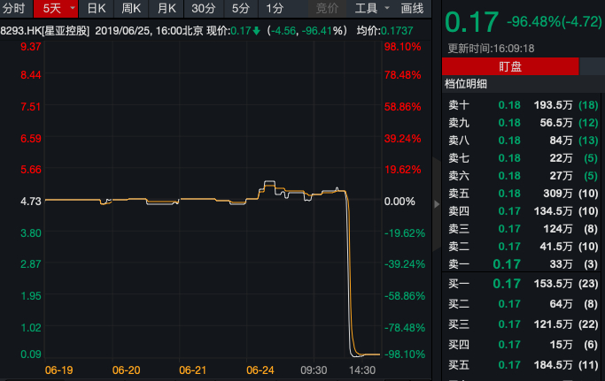 6月25日午后,港股星亚控股(08293.HK)一度出现暴跌98%,股价从5港元直接跌到0.091港元。最终收盘下跌96.48%,收盘价为0.172港元,投资者损失惨重。