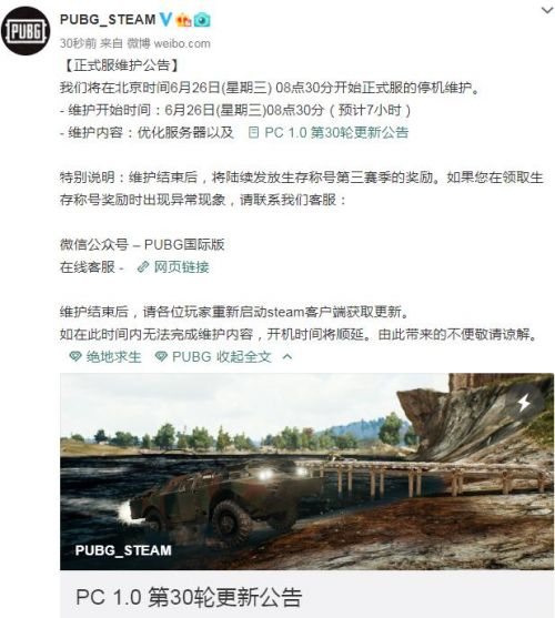 绝地求生6月26日更新到几点,绝地求生6月26日更新内容一览。绝地求生官方发布了6月26日正式服的更新维护内容,6月26日早上8点30开始停机维护,预计维护时间是7个小时,下面我们一起来看下具体的更新内容。