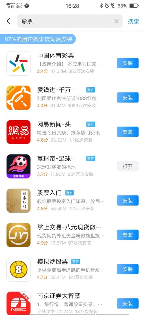 尽管相关部门针对涉赌App平台一直保持高压严打的态势,但财经网发现,在各种应用市场中依然存在着一些涉赌App,在输入“彩票”、“体彩”等关键词之后,搜索列表中就会出现多款对应App。