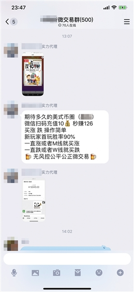 江西公安在上述文章中还提到,犯罪嫌疑人在购买系统、建立虚假平台之后,往下面就发展数十个代理公司,每一个代理公司下面有几十个员工,也就是业务员,这些业务员再去联系受害人,通过加微信或打电话的方式,引诱受害人到他们平台进行交易。平台业务员还会建立一个虚假微信群,在群里发布各种虚假信息,诱骗受害者加大投入。部分微交易平台也会在微信公众号、各大财经论坛发软文吸引客户,甚至把微交易包装成可以赚钱的微信手游。