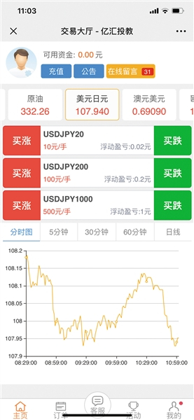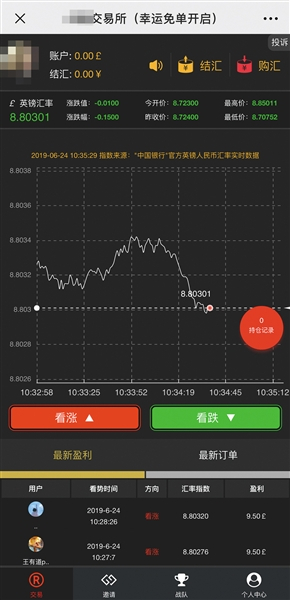 新京报记者随机进入一个微交易QQ群“亿汇投教”,目前该平台主打“贵金属”及“外汇”交易。交易周期少的不过60秒、多的5分钟。选择“60秒”,就意味着该笔订单将在60秒后完成结算。投资人做出买涨或买跌的决定,选择购买金额然后下单,单笔最小订购金额为10元,60秒后根据价格走势,判断正确即为赢,判断错误就是亏损。10元的订单需要投资者提供1.5元的手续费用。