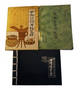 《中国诗词典故菜谱》黑龙江科学技术出版社1986年出版(上左);《陆游饮食诗选注》中国商业出版社1989年出版(上右);《连环绘食画》二毛2010年编著(下)。