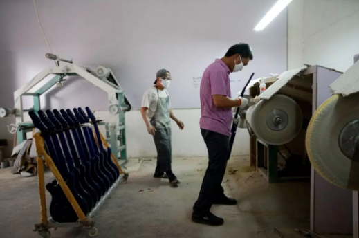 45岁的赵女士边娴熟地给吉他调着音边说,做完工厂里的这批订单,她该下地给庄稼施肥了。小镇上有一万多名居民和她一样,农忙之余在乐器厂上班,每月平均收入5000元左右。