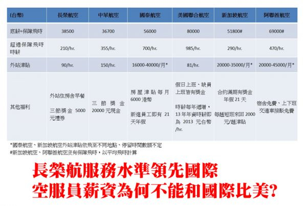 工会制作的长荣航空与其他航空公司工资待遇对比图,需要说明的是该表未将年终奖纳入统计