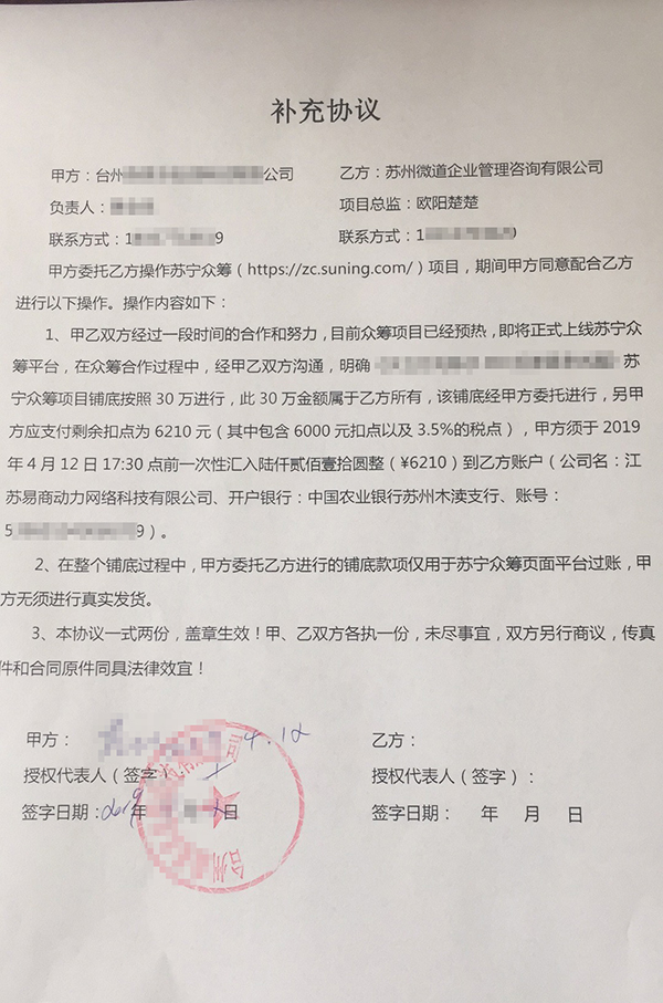 黄安也不例外。当天,他就与自称是苏宁众筹“战略合作伙伴”服务商苏州微道公司签订了合同,合同上还打着“苏宁众筹深度服务”印花。