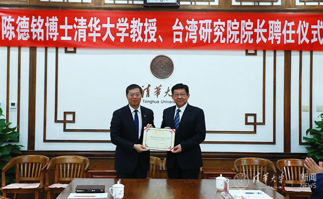 据清华新闻网6月24日消息,6月21日,陈德铭博士清华大学教授、台湾研究院院长聘任仪式在工字厅东厅举行,清华大学校长邱勇出席并向陈德铭颁发聘书。