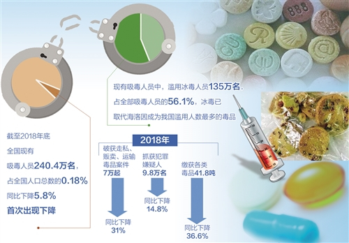 据了解,2018年,我国现有吸毒人数占全国人口总数的0.18%,首次出现下降。尽管治理毒品滥用取得一定成效,但合成毒品滥用仍呈蔓延之势,滥用毒品种类和结构也发生了新变化。