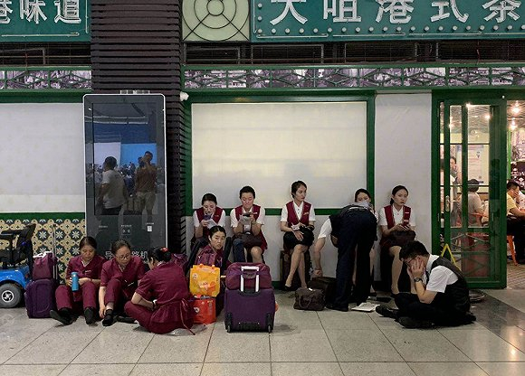 乘客走不了,列车工作人员也走不了。18点40分,高铁乘务员和清洁人员坐在一家茶餐厅外面等候。