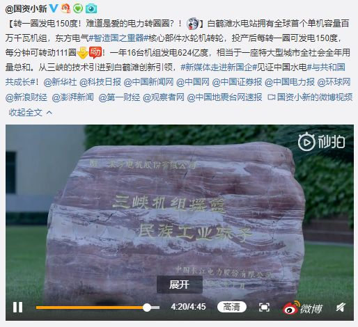 昨晚8时许,@国资小新 在微博上发了一条题为“转一圈发电150度!难道是爱的电力转圈圈?!”的微博,说的是白鹤滩水电站拥有全球首个单机容量百万千瓦机组,东方电气核心部件水轮机转轮,投产后每转一圈可发电150度,每分钟可转动111圈,一年16台机组发电624亿度,相当于一座特大型城市全社会全年用量总和。↓