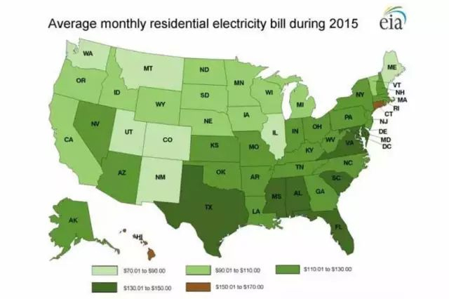 图片左下角,那块星星点点的深棕色是美丽的夏威夷,由于夏威夷是孤岛电网,所以电费非常高,每月平均水平是150~170美元。