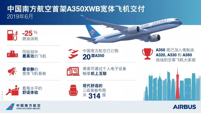 截至今年5月底,南航运营着335架空客飞机,包括282架A320系列飞机、48架A330系列飞机和5架A380飞机。南航与空客的合作历史由来已久,1997年,南航引进机队首架A320飞机,这是南航引进的第一架空客飞机;2005年2月,南航引进机队首架A330-200飞机,成为中国内地首家运营该机型的航空公司;2011年,南航首架A380交付,并顺利投入运营。今天,南航即将迎来远程宽体飞机的新篇章——接收全球最新一代远程宽体飞机A350。