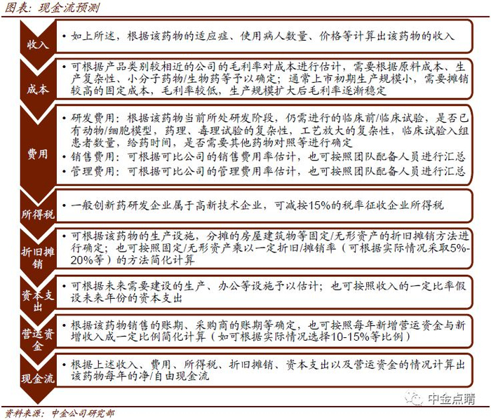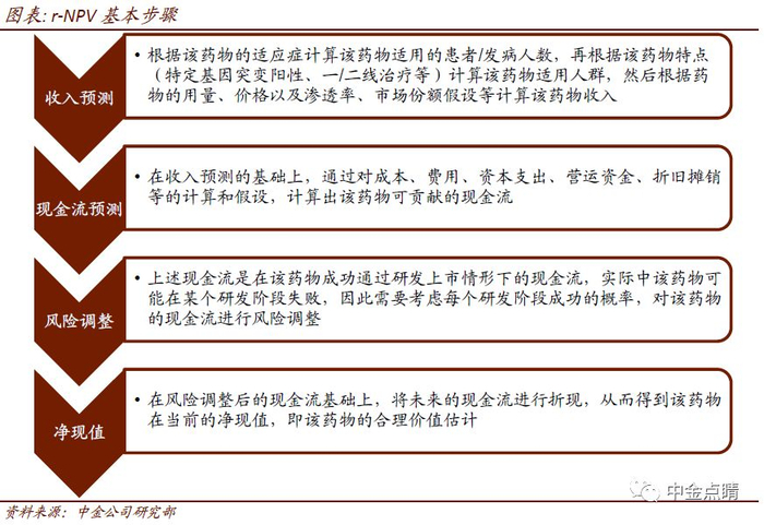 创新药的营收、利润多在未来年份贡献,因此以折现现金流原理为基础的r-NPV法是常用的创新药的估值方法。r-NPV法的基本步骤包括:收入预测—>现金流预测—>风险调整—>净现值。