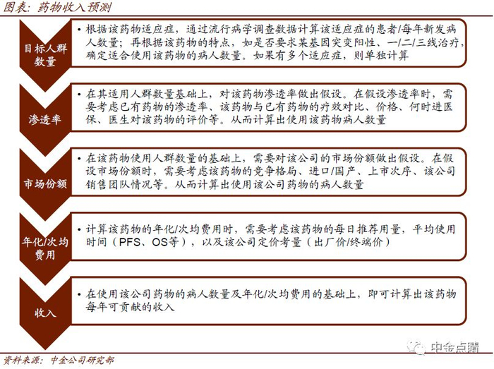 ► 收入预测需从适应症出发,从病人数量结合药物特点(特定基因突变阳性、一/二/三线治疗等)计算该药的适用人群,再通过与同类药物的比较及在研厂商的情况,对该药物的渗透率、市场份额等做出假设,然后结合公司对定价的考虑计算该药物的收入。我们对多款重磅药物的全球销售曲线进行了分析,一款新药约在10-15年达峰,专利到期后销售额大幅下滑;而国内由于医保目录、招标制度以及医生用药习惯的存在,达峰速度相对较慢,专利到期后销售额下降幅度也相对较低。预测期的选择通常要包含至该药物专利到期的年份,通常选取【10】-【15】年。