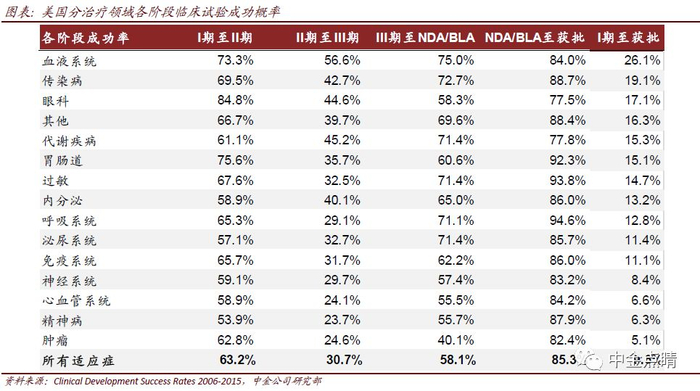 ► 新药在研发过程有较高的失败率,因此需要对上述现金流进行风险调整,可结合药物当前研发进展对该药物能够成功商业化的概率作出判断。值得注意的是,美国一个新药研发项目从I期至商业化的概率仅为9.6%,但目前国内新药研发多属me-too/me-better类药物,靶点和作用机理已经得到证实,研发成功率相对较高;随着first-in-class、best-in-class新药研发项目的增多,国内新药研发成功率会相对降低。