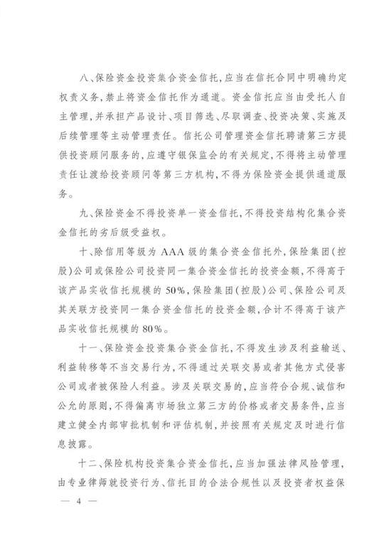 十、除信用等级为AAA级的集合资金信托外,保险集团(控股)公司或保险公司投资同一集合资金信托的投资金额,不得高于该产品实收信托规模的50%,保险集团(控股)公司、保险公司及其关联方投资同一集合资金信托的投资金额,合计不得高于该产品实收信托规模的80%。