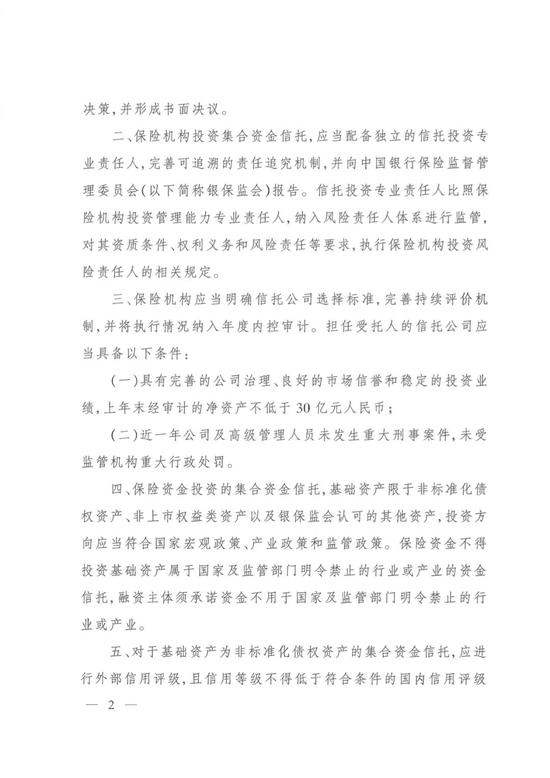 另外,在保险资金投资集合资金信托的资产投向上,《通知》要求,基础资产限于非标准化债权资产、非上市权益类资产以及银保监会认可的其他资产,投资方向应当符合国家宏观政策、产业政策和监管政策。