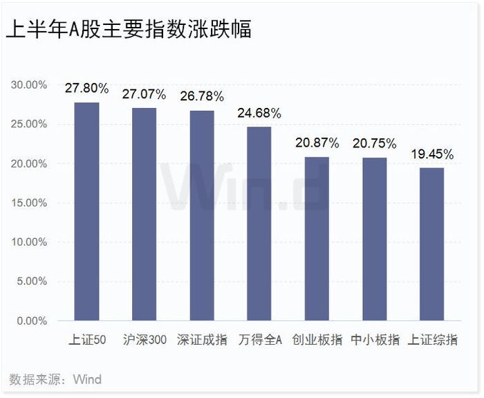 上半年,A股各大指数全线上涨。上证指数累计涨19.45%,深证成指涨26.78%,创业板指数涨20.87%。