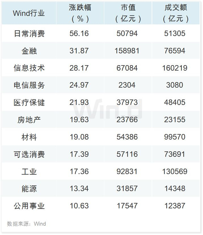 上半年,Wind一级行业全线上涨,日常消费、金融板块涨幅居前,分别上涨56.16%、31.87%,信息技术、电信服务、医疗保健涨幅均超20%。