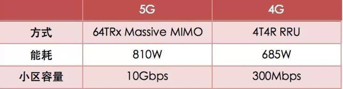 在运营商的5G站点中,我们通过对比5G 64TRx Massive MIMO与4G 4T4R RRU发现,两者能耗分别是810W和685W,基本上是在一个数量级,但是两者提供的小区容量分别是10Gbps和300Mbps,前者是后者的30多倍。