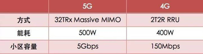 5G 32TRX Massive MIMO与4G 2T2R RRU相比,单模块功耗分别是500W和400W,但是小区容量分别是5Gbps和150Mbps, 前者是后者的30多倍。