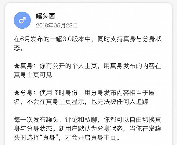 这种分裂集中体现在最后发布的3.0版本中,同时支持真身与分身状态,真身有公开的个人主页,可以被人追踪发现。而分身则是临时身份,用分身发布的内容不会在真身主页显示,也无法被任何人追踪。