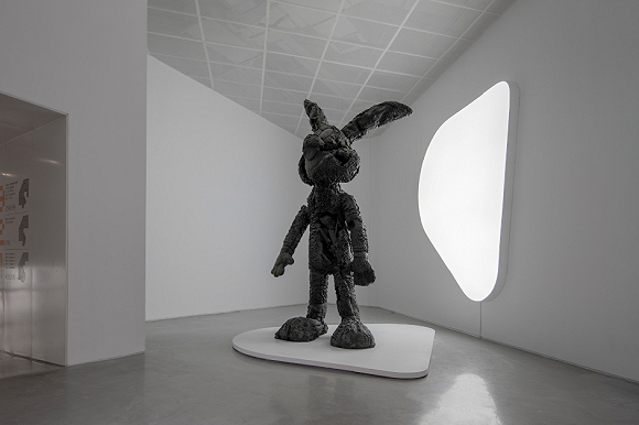 再比如说兔子,兔子最早的时候我做了一个大概这么高的雕像,后来我就把这个尺寸不断的扩大,一方面我们可以从一个第三者的角度去审视这个物件,如果说这个物件是非常大的话,我们就会把它看作一个陌生的物件,而且建筑也是我作为艺术家一直想追寻的主题,我对于材料的关注也是非常高,我经常会去想这个材料在物理上有哪些功能、哪些性质,如果说要把这个小兔子扩大到很大规模的话,在材料的使用也会出现一些改变。我把这个兔子进行了扩大,然后挑选了青铜这种非常经典的材料进行构建,上面的铜锈也是一个有意为之的动作,因为在古老的物件当中,铜锈是会经常出现的元素。