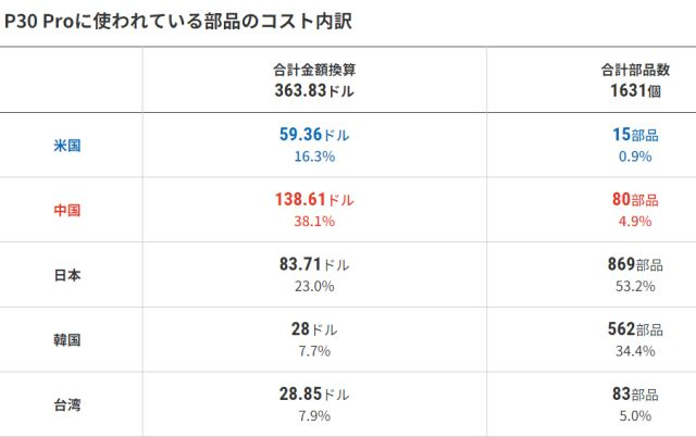 依据日媒统计的P30 Pro的零部件成本数据,一台P30 Pro手机当中,来自美国的零件为15个,总价值为59.36美元,占总价的比例为16.3%;来自中国大陆的零件为80个,总价值为138.61美元,占比为38.1%;来自日本的零件为869个,总价值为83.71美元,占比为23.0%;来自中国台湾地区的零件为83个,总价值为28.85美元,占比为7.9%;来自韩国零件为562个,总价值为28美元,占比为7.7%。