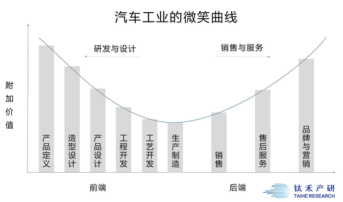 通过图纸数据和先进生产线的引进,中国人最先具备了制造的能力。然后慢慢开始由制造能力向两端去延伸——微笑曲线的一端是产品研发与设计,从产品定义开始,然后造型设计,再到产品设计和工程开发。微笑曲线的另一端,是销售、品牌营销和售后服务。