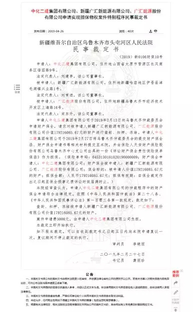 同日,中国裁判文书网还公布了中化二建集团、新疆广汇新能源有限公司(以下简称“广汇新能源”)、广汇能源申请实现担保物权案件特别程序民事裁定书,裁定查封、扣押、冻结被申请人广汇新能源、广汇能源价值179216085.67元的财产。