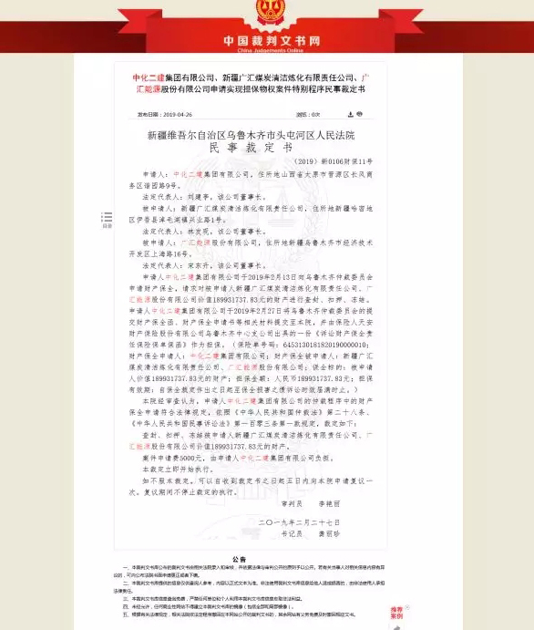 《中国能源报》记者发现,中国裁判文书网于4月26日公布了新疆维吾尔自治区乌鲁木齐市头屯河区人民法院民事裁定书,主要内容为中化二建集团有限公司(以下简称“中化二建集团”)、新疆广汇煤炭清洁炼化有限责任公司(以下简称“广汇清洁炼化”)、广汇能源申请实现担保物权案件特别程序民事裁定书,裁定查封、扣押、冻结被申请人广汇清洁炼化、广汇能源价值189931737.83元的财产。