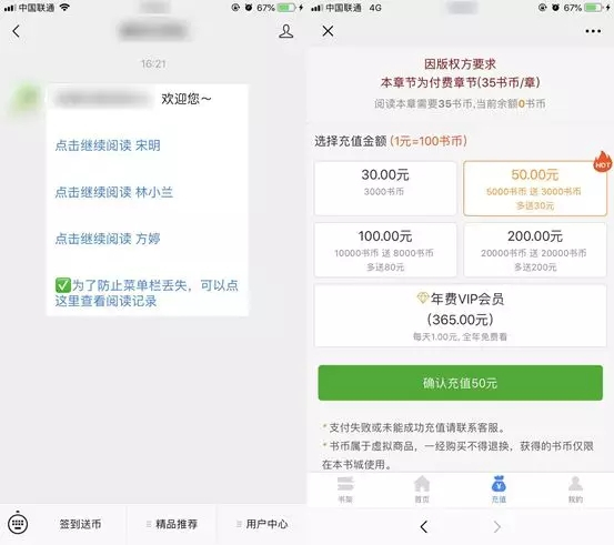 引导用户关注公众号后,他们一般不会直接公众号上发布低俗内容,而是通过图文消息的阅读原文、二维码、以及自定义菜单、自动回复等形式,引流至色俗小说外链,从而引诱用户充值来获利。