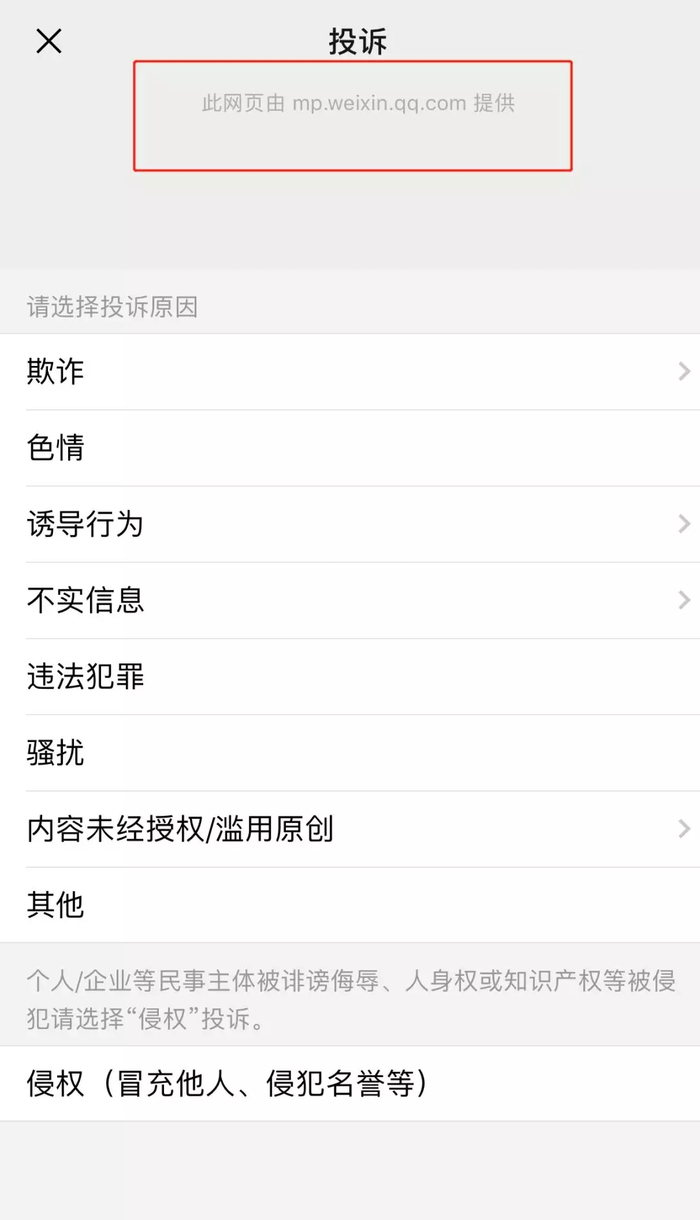 在文章的页面上,会有显眼的“投诉”按钮。点击后,你会看见跟微信投诉极度相似的一个页面。