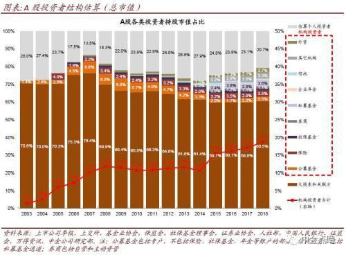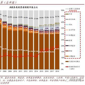 历史上A股散户占比高、市场投机气氛重、有效性弱,但随着A股近年不断开放以及本土机构投资者的发展,A股投资者结构正在逐步国际化、机构化,这也在逐步改变A股的表现特征,值得所有参与者重视。我们综合多方面数据估算来自大股东、基金、保险、外资等各类主要机构投资者及个人投资者在A股市场的持股,结果显示:
