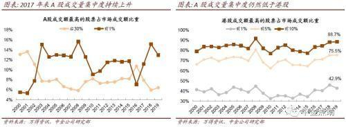 4)成交越来越向“龙头”集中:2018年,成交量前1%的A股合计占到市场成交量的15%,是2009年以来最高;成交量后30%的A股占市场成交的比例是6%,是2009年以来最低。