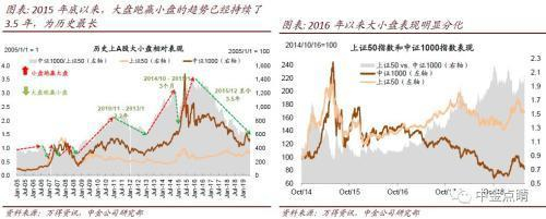 3)中小盘估值溢价收窄:在A股市场,以创业板为代表的中小市值股票对大盘股估值长期享有溢价,然而2016年以来,中小盘指数相对于大盘股的估值溢价已经收窄到历史最低水平。