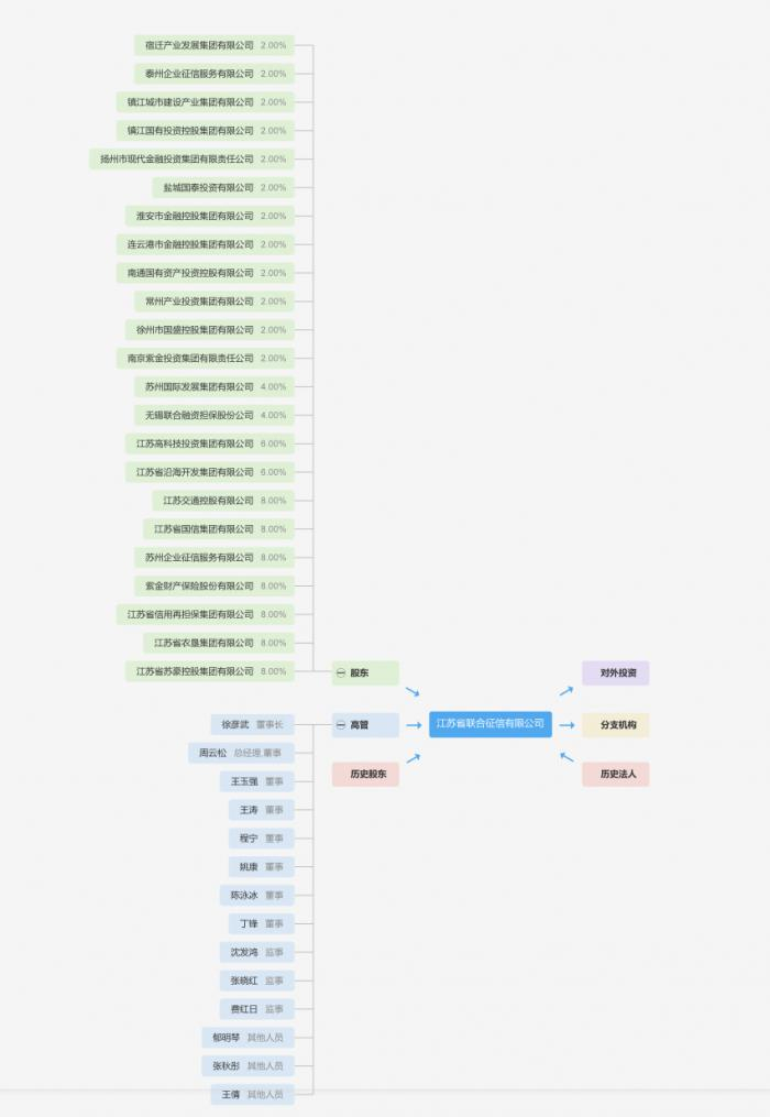 企查查显示,江苏省联合征信有限公司注册资本5亿元人民币,共有23家股东,股权结构比较分散。江苏省信用再担保集团有限公司、苏州企业征信服务有限公司、江苏省国信集团有限公司、江苏交通控股有限公司、江苏省农垦集团有限公司、江苏省苏豪控股集团有限公司、紫金财产保险股份有限公司等7家股东分别持有8%股份。