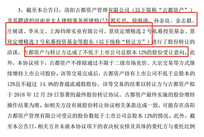 2018年12月,金冠股份实际控制人徐海江与古都资管签订《合作意向协议》,徐海江承诺协调徐海江以外的其他股东将其持有的公司普通流通股股份转让给古都资管。