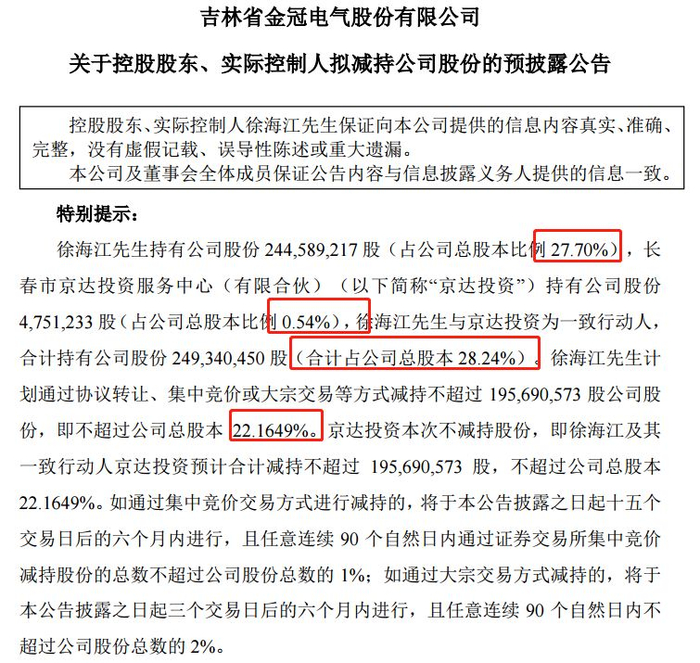 徐海江跟一致行动人持有金冠28.24%的股份,想要减持不超过公司总股本的22.16%,也就是说徐海江要把手里差不多80%的股权全部卖了。