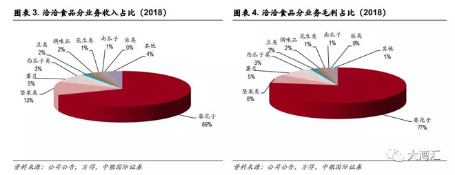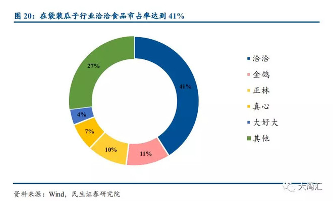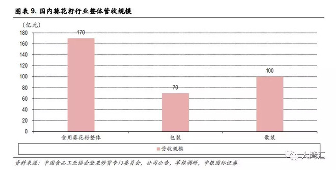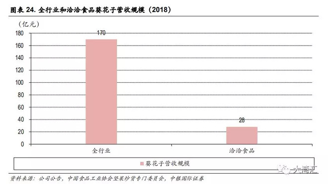 由于目前我国瓜子主流仍是散装炒货,2018年瓜子消费总金额170亿元,其中散装占比100亿元,预包装瓜子占比仅70亿元,其中洽洽瓜子业务营收28亿元,占比预包装瓜子的41%市场份额。